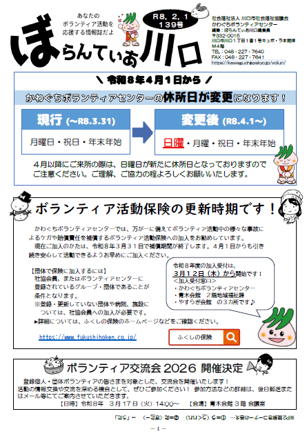 ・かわぐちボランティアセンター休所日変更のお知らせ